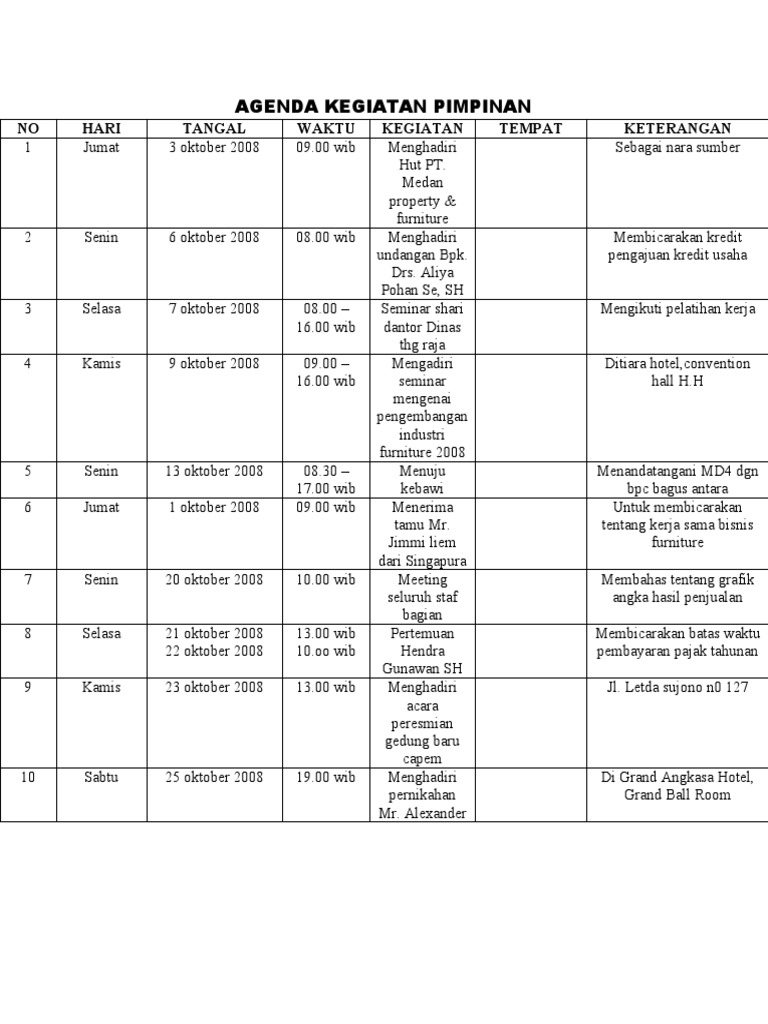 7 rows Contoh Agenda Perjalanan Pimpinan. Contoh agenda kegiatan pimpinan mingguan PT SURYA KENCANA Jadwal Acara Kegiatan Pimpinan No HariTanggal Acara Kegiatan Jam Tempat Keterangan 1 Senin 27 Meeting Antar Devisi 0800- Ruang Februari 2012 0900 Serbaguna Menjenguk Bapak Ramli 1100- RS Mitra Makan siang di 1200 Keluarga Restoran Indah Kembali ke Kantor 1330 2 Selasa 28. Sesi untuk pimpinan memberikan materi dilaksanakan pada tanggal 23 Oktober 2015 hari Jumat jam 1900-2100 WIB di ballroom Inna Garuda Hotel Yogyakarta Jl.